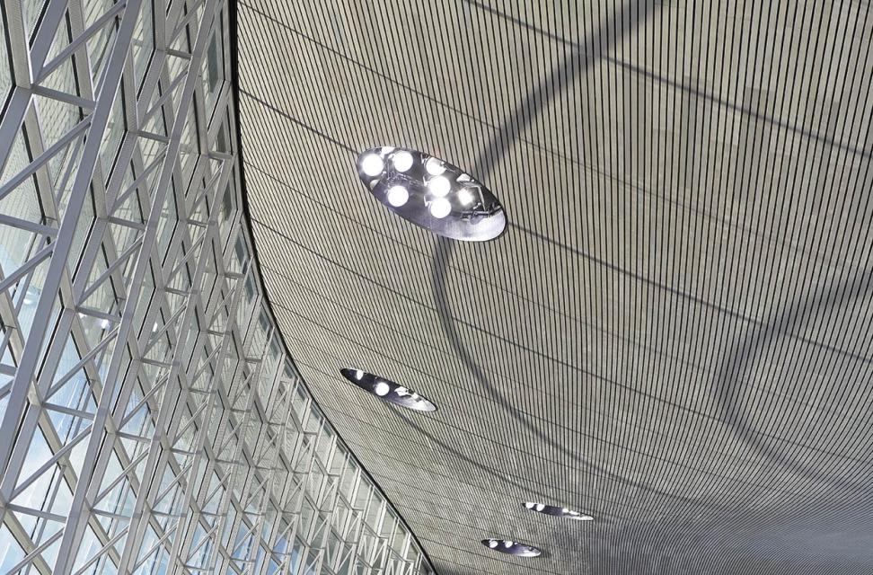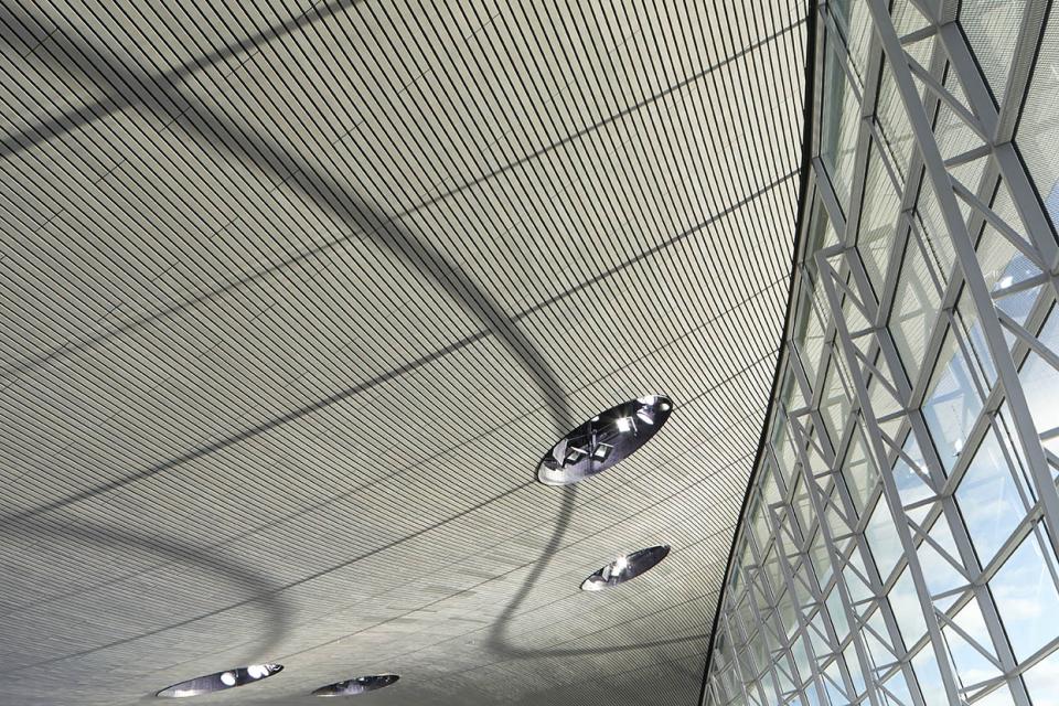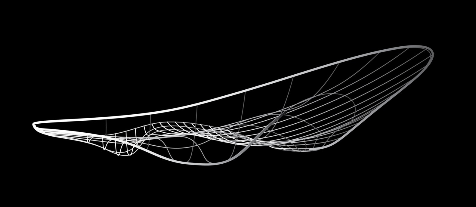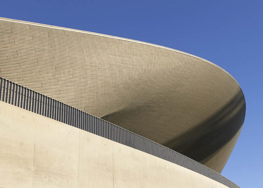 The pool hall is expressed above the podium level by a large roof arching along the same axis as the pools, its form generated by sight-lines for spectators during Olympic mode. Double-curvature geometry creates a structure of parabolic arches that provide the unique characteristics of the roof.