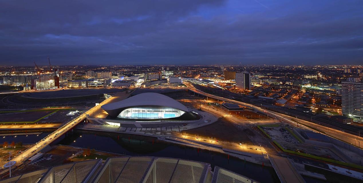 The LAC is planned on an orthogonal axis perpendicular to the Stratford City Bridge, along which the three pools are laid out. The training pool is located under the bridge whilst the competition and diving pools are within a large volumetric pool hall. The overall strategy is to frame the base of the pool hall as a podium by surrounding it and connecting it into the bridge.