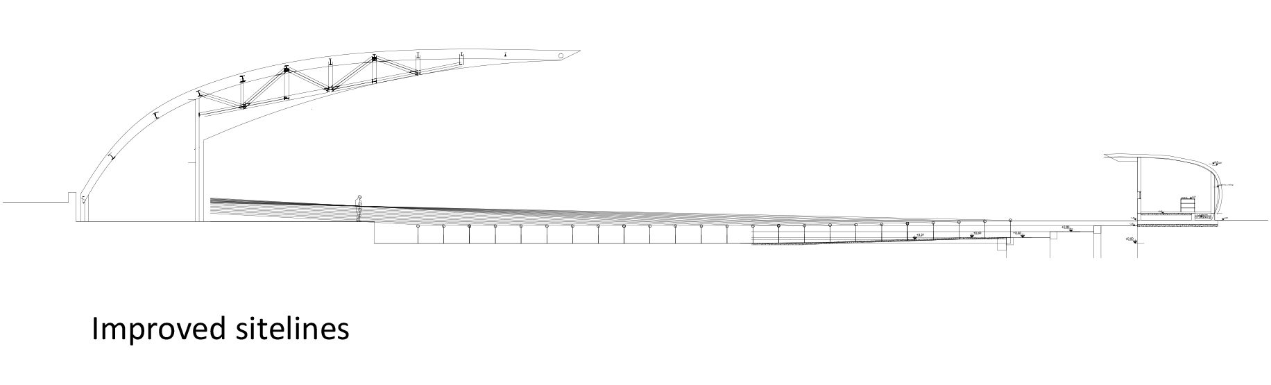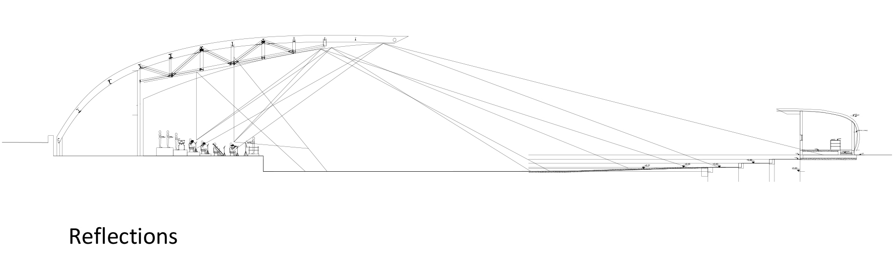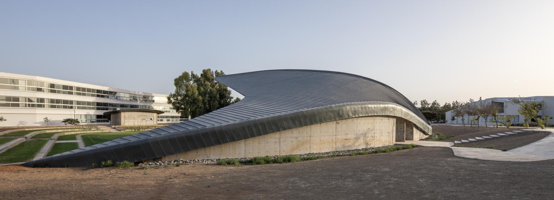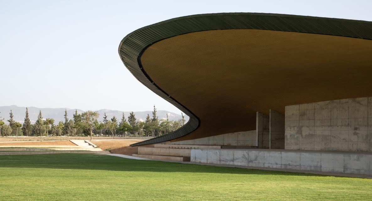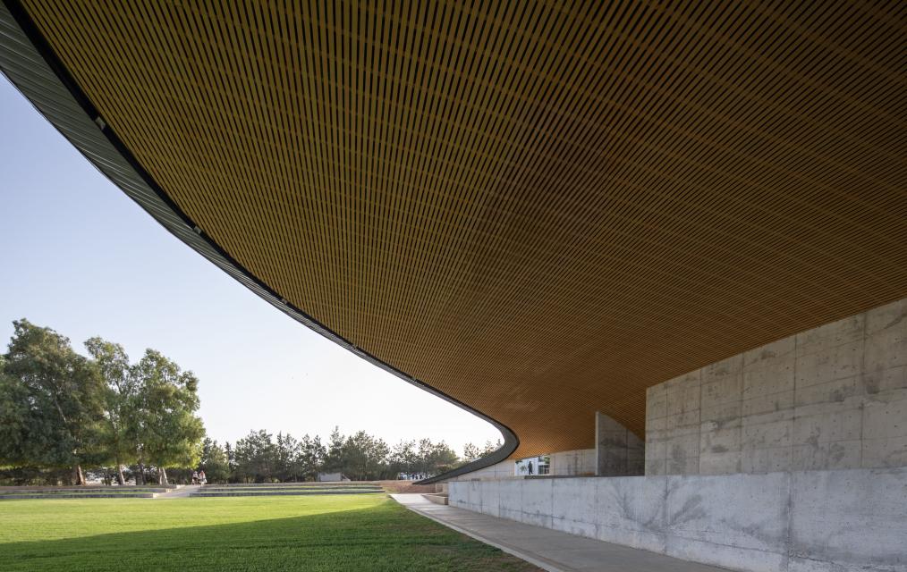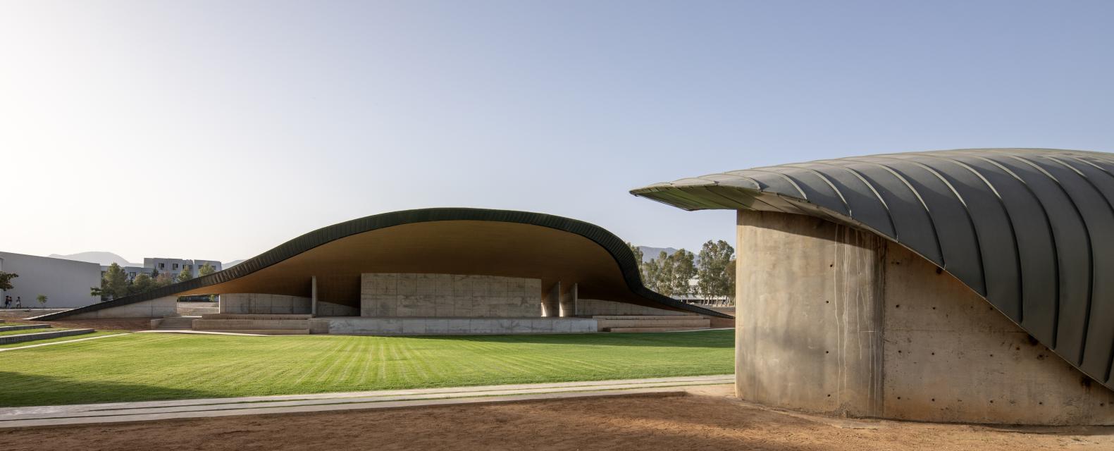 The stage faces a 4,000 square-meter lawn and it is designed to accommodate demountable or reconfigurable equipment, such as an inflatable cinema screen and consoles for audio and lighting control. A grand shell structure partially wraps around the site, cantilevering up to 17 meters over the stage, embracing the soft “lawn” between the main structure and the control building at the back. This landscape features a gradual concave incline to improve sightlines between the stage and the audience. Additionally, there are backstage spaces for performers for preparation and storage of stage equipment. The control building provides indoor and outdoor spaces for sound control, audio mixing, lighting, and video performance. Sustainability is integral to the design, relying on daily use of the site. The partially roofed design and minimal enclosures create an equitable environment that is energy-saving and cost-effective. The Centre reinterprets historical amphitheatres of the region, addressing modern sustainability concerns while enriching university and local community life.