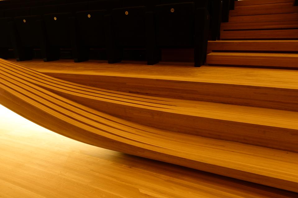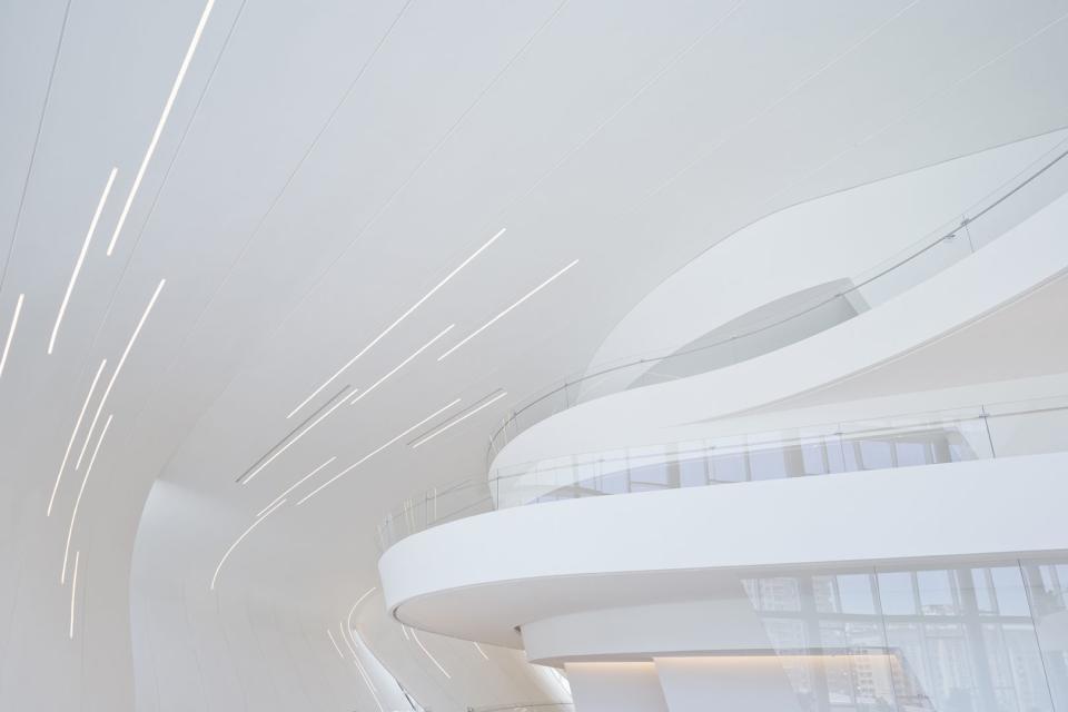 In this architectural composition, if the surface is the music, then the seams between the panels are the rhythm. Numerous studies were carried out on the surface geometry to rationalize the panels while maintaining continuity throughout the building and landscape. The seams promote a greater understanding of the project’s scale. They emphasize the continual transformation and implied motion of its fluid geometry, offering a pragmatic solution to practical construction issues such as manufacturing, handling, transportation and assembly; and answering technical concerns such as accommodating movement due to deflection, external loads, temperature change, seismic activity and wind loading.
